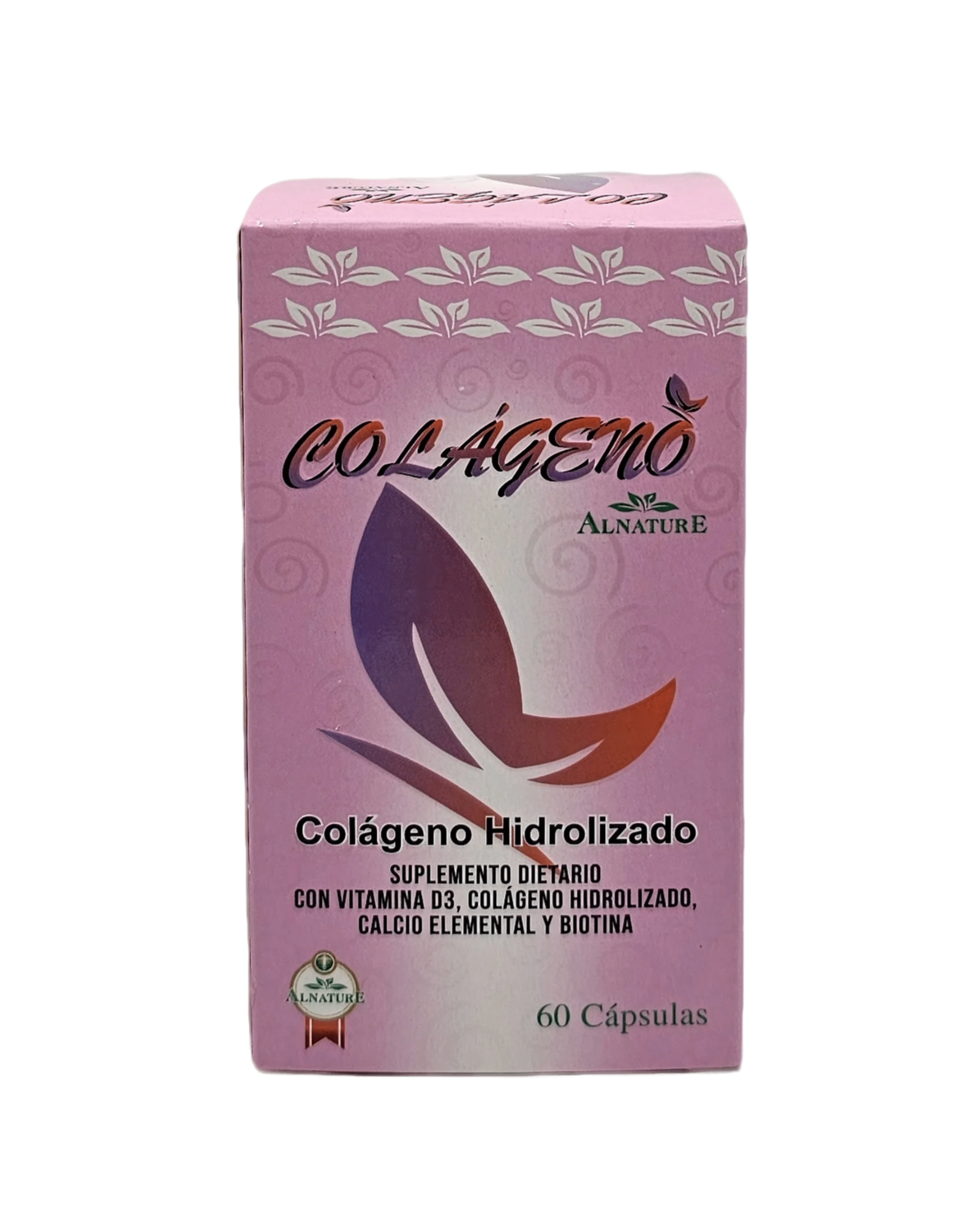 Suplemento dietario en cápsulas formulado con colágeno hidrolizado, vitamina D3, biotina (B8) y calcio, diseñado para apoyar la salud de la piel, cabello, uñas, huesos y articulaciones. Ideal para adultos que buscan mantener un equilibrio nutricional y promover un envejecimiento saludable.
