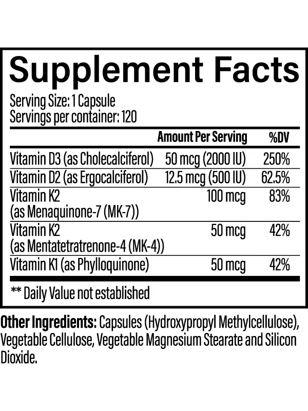 Es un suplemento en cápsulas que combina vitamina D3 y vitamina K2, esenciales para la correcta absorción y utilización del calcio, apoyando la salud ósea, cardiovascular y el sistema inmune.