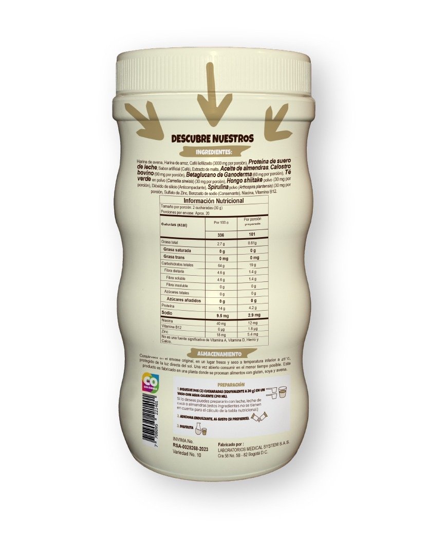 Potencia tu día con GANUDERMUSS, una mezcla inteligente de avena con café liofilizado, proteína de suero de leche, calostro bovino, hongo Shiitake y betaglucanos de Ganoderma.