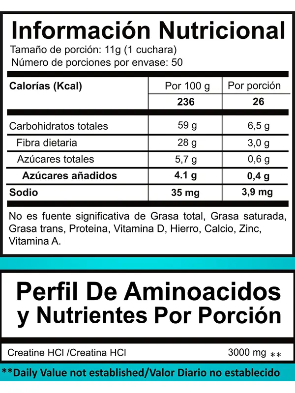 Ingredientes: Polvo Deshidratado de Frutas de Uva, Creatina HCL, Sucralosa (Edulcorante), Saborizante Idéntico al Natural, Aspartame (Edulcorante), Goma Xanthan (Espesante), Benzoatode Sodio (Conservante), Ácido Citrico (Acidulante), Ácido Málico (Acidulante), Dióxido de Silicio(Anticompactante), Silicato de Calcio (Espesante), Colorante Rojo FD&C CI 45430. Fenilcetonuricos: Contiene Fenilalanina.