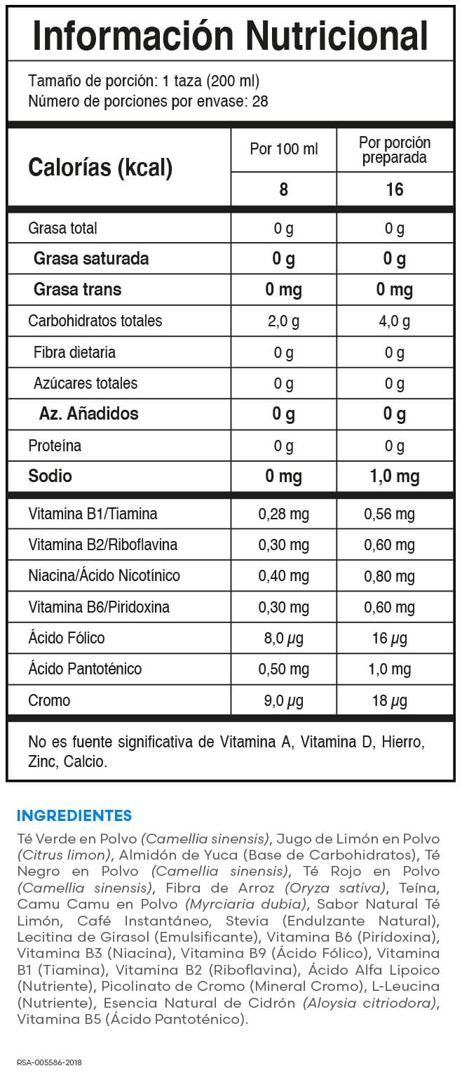 TÉ VERDE + TÉ NEGRO + TÉ ROJO + LIMÓN + CAMU CAMU + COMPLEJO B + CROMO