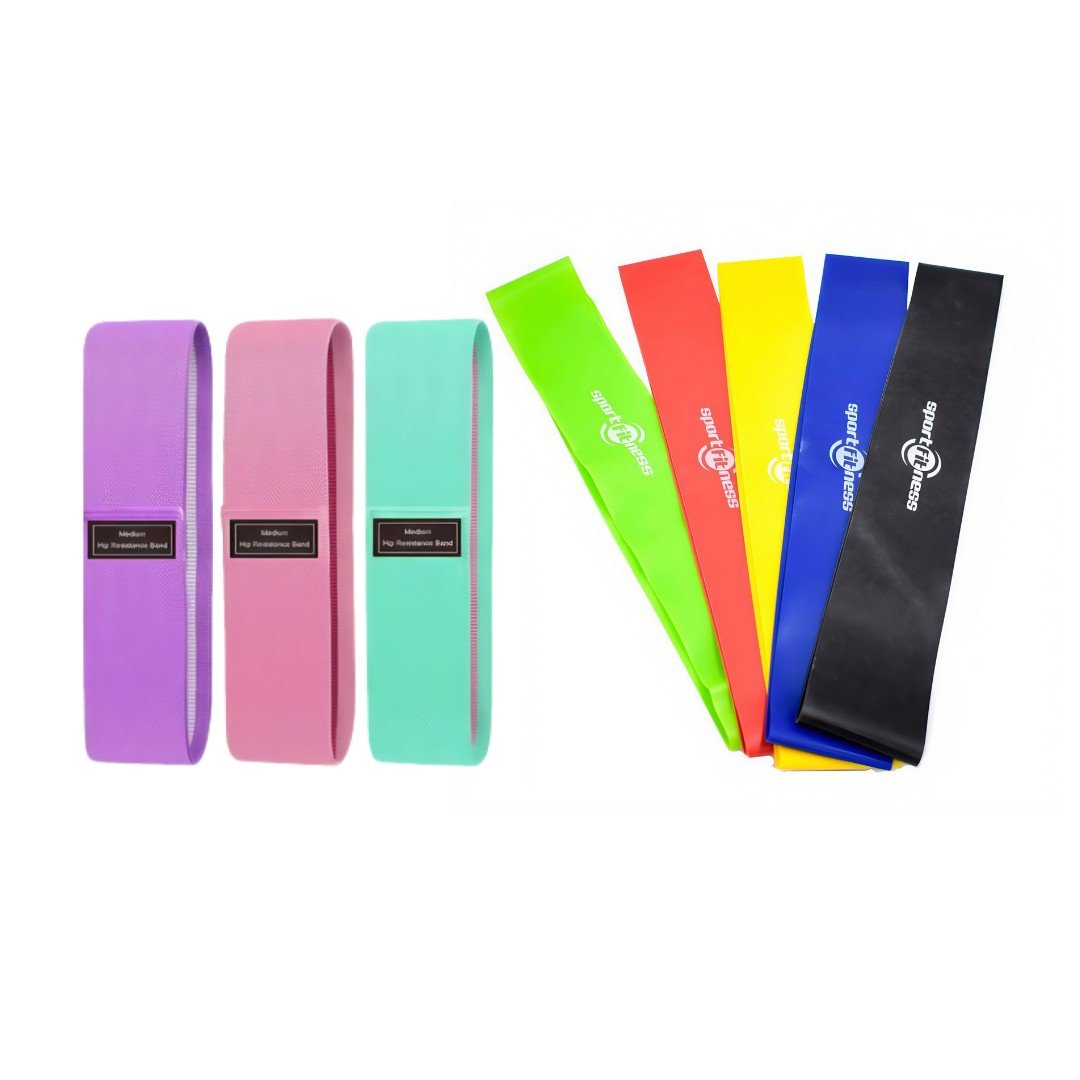 Set completo que incluye 5 bandas de látex de diferente resistencia y 3 bandas de tela antideslizante. Perfectas para entrenamiento funcional, yoga, glúteos, piernas, brazos y rehabilitación. Adaptables a todos los niveles de entrenamiento.