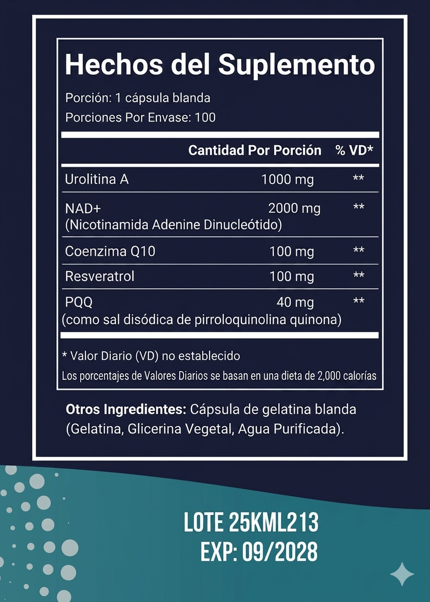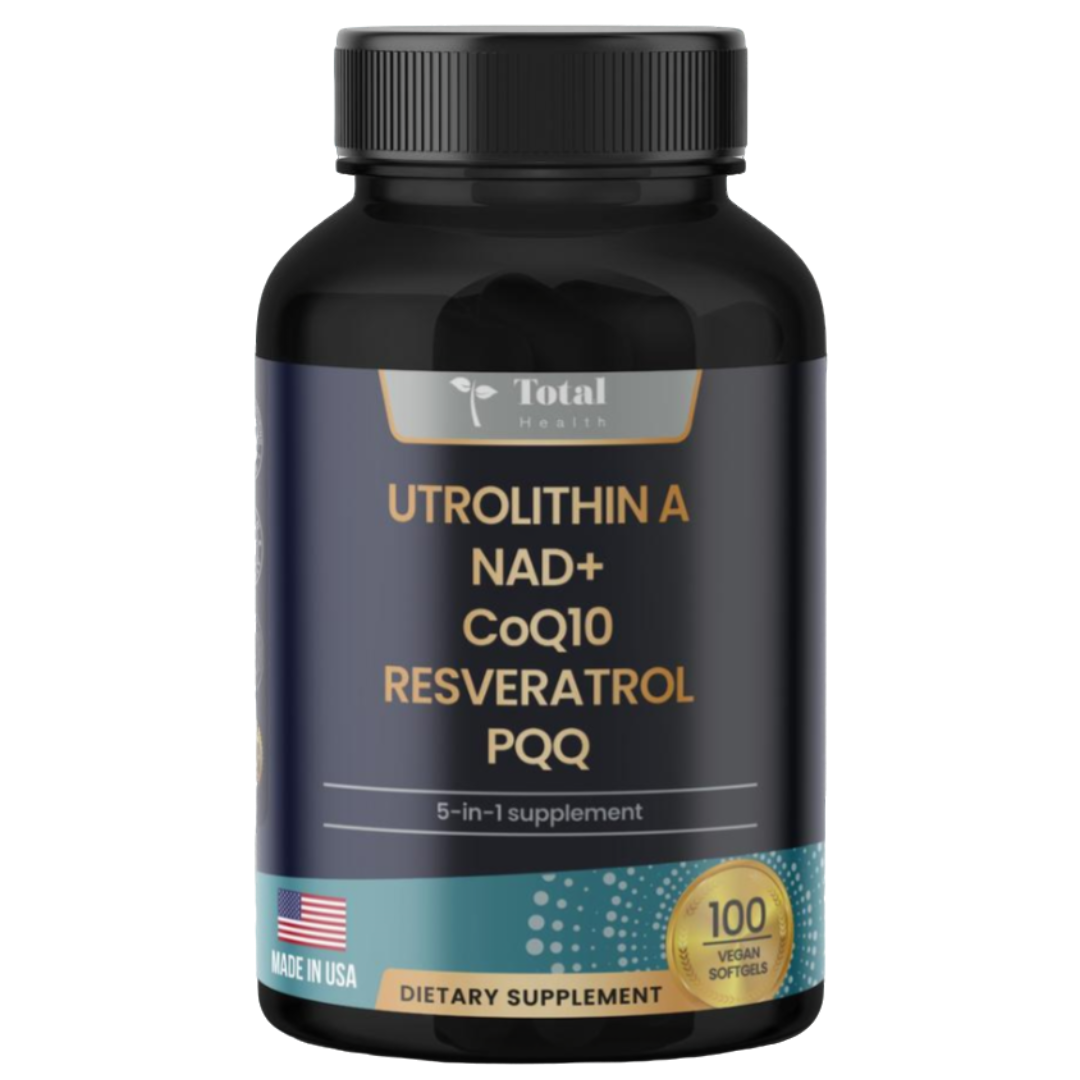 Urolithin A + NAD+ + CoQ10 + Resveratrol + PQQ: fórmula avanzada enfocada en la salud mitocondrial, promoviendo energía celular, longevidad, rendimiento físico y mental.