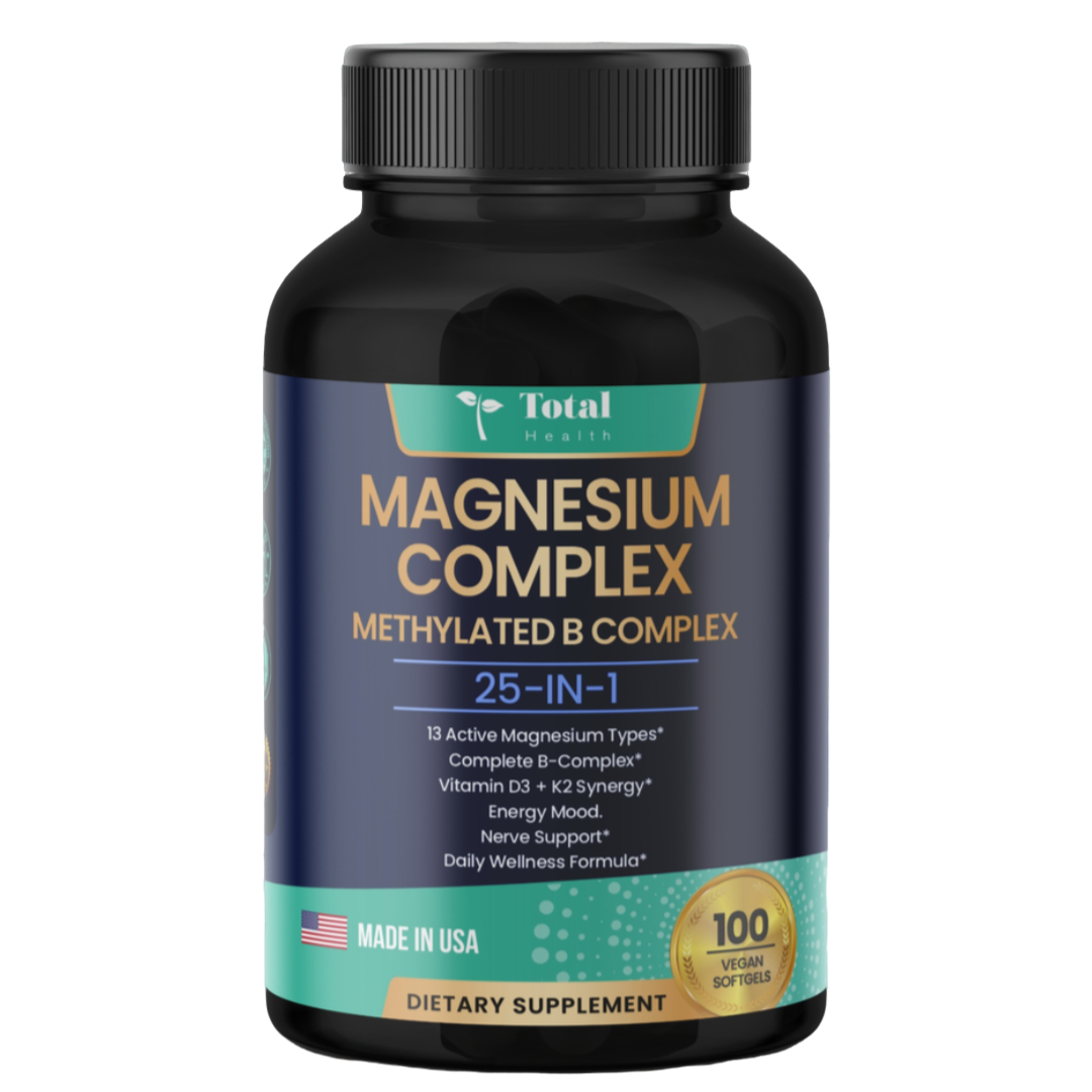 Magnesio Complex 25 en 1: fórmula avanzada que ayuda al sistema nervioso, reduce el estrés, mejora el sueño y aumenta la energía.