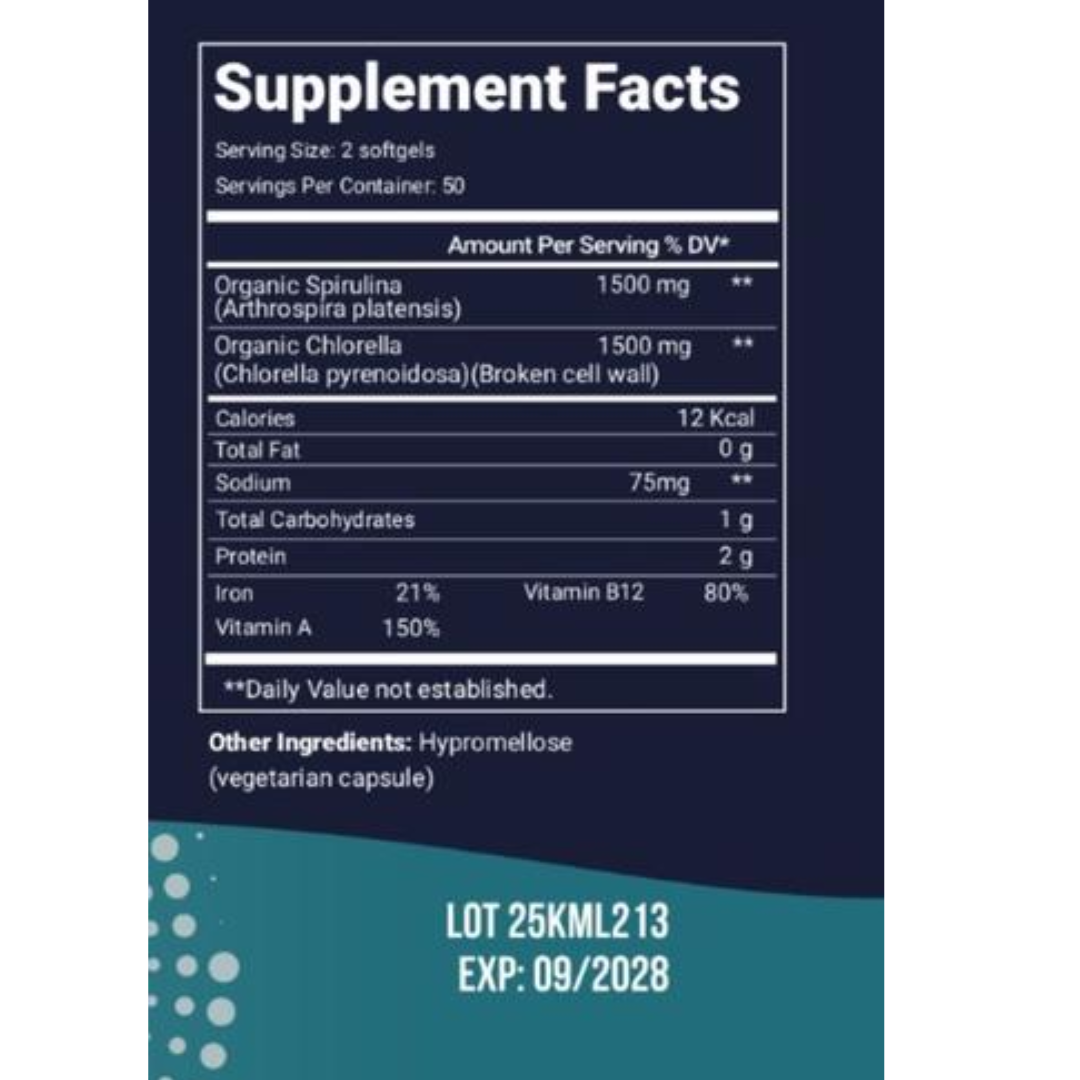 Spirulina + Chlorella 3000 mg: superalimentos ricos en nutrientes que ayudan a desintoxicar el organismo, fortalecer el sistema inmune y mejorar la energía.