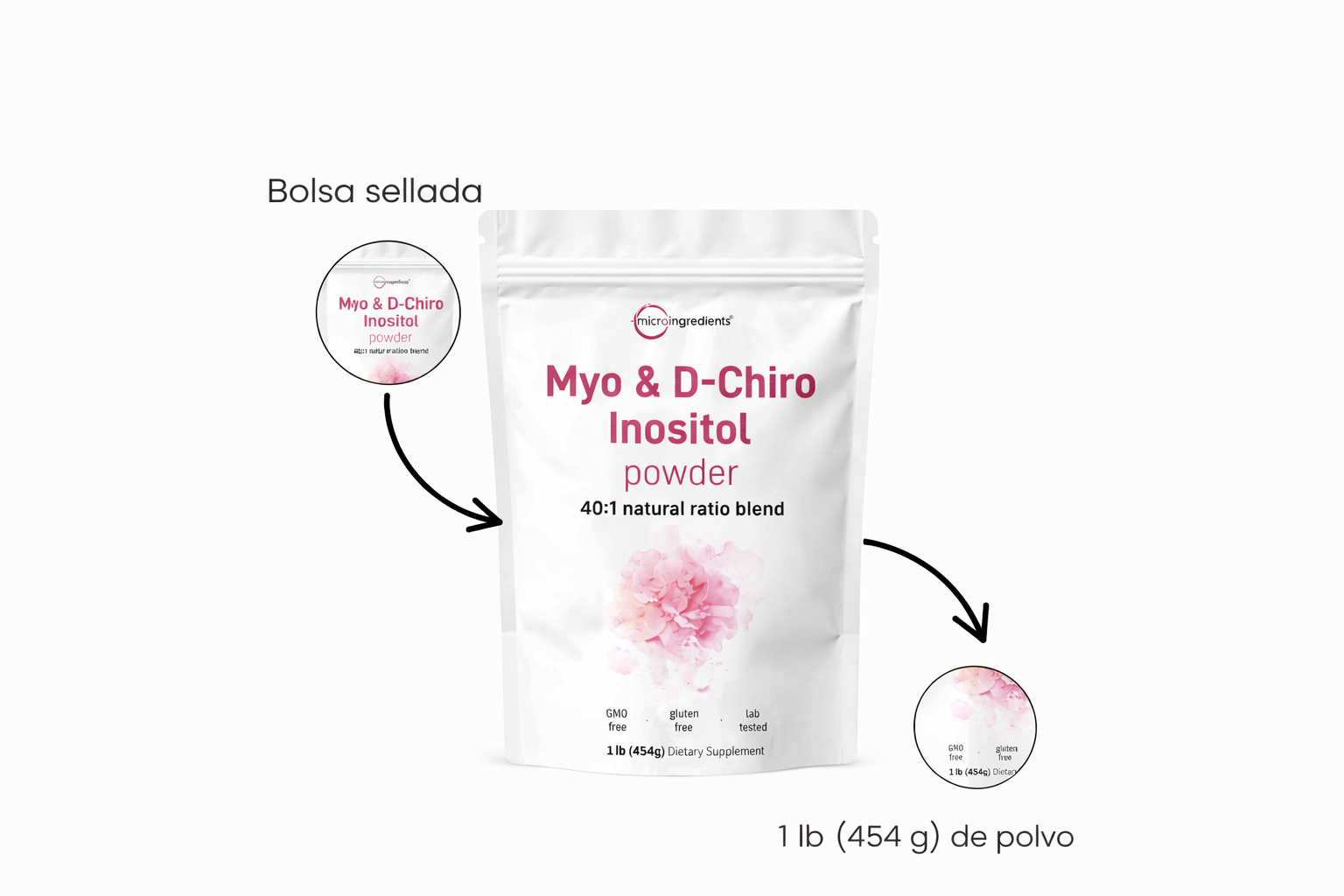 Myo D Chiro Inositol en polvo Presentaci n de 1 lb 454 g Suplemento en polvo en relaci n 40 1 presentado en una bolsa sellada y resellable ideal para mantener la frescura del producto F rmula libre de GMO libre de gluten y probada en laboratorio perfecta para quienes buscan una opci n pura y de alta calidad Pr ctico seguro y f cil de dosificar