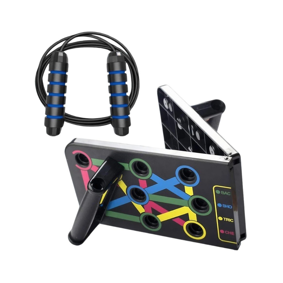 El Combo Tabla Push Up + Lazo de Resistencia es una solución integral para trabajar diferentes grupos musculares. La tabla codificada por colores guía tus flexiones para activar pectorales, hombros, tríceps y abdomen, mientras el lazo de resistencia complementa tu rutina con ejercicios de estiramiento y tonificación para tren inferior y superior.