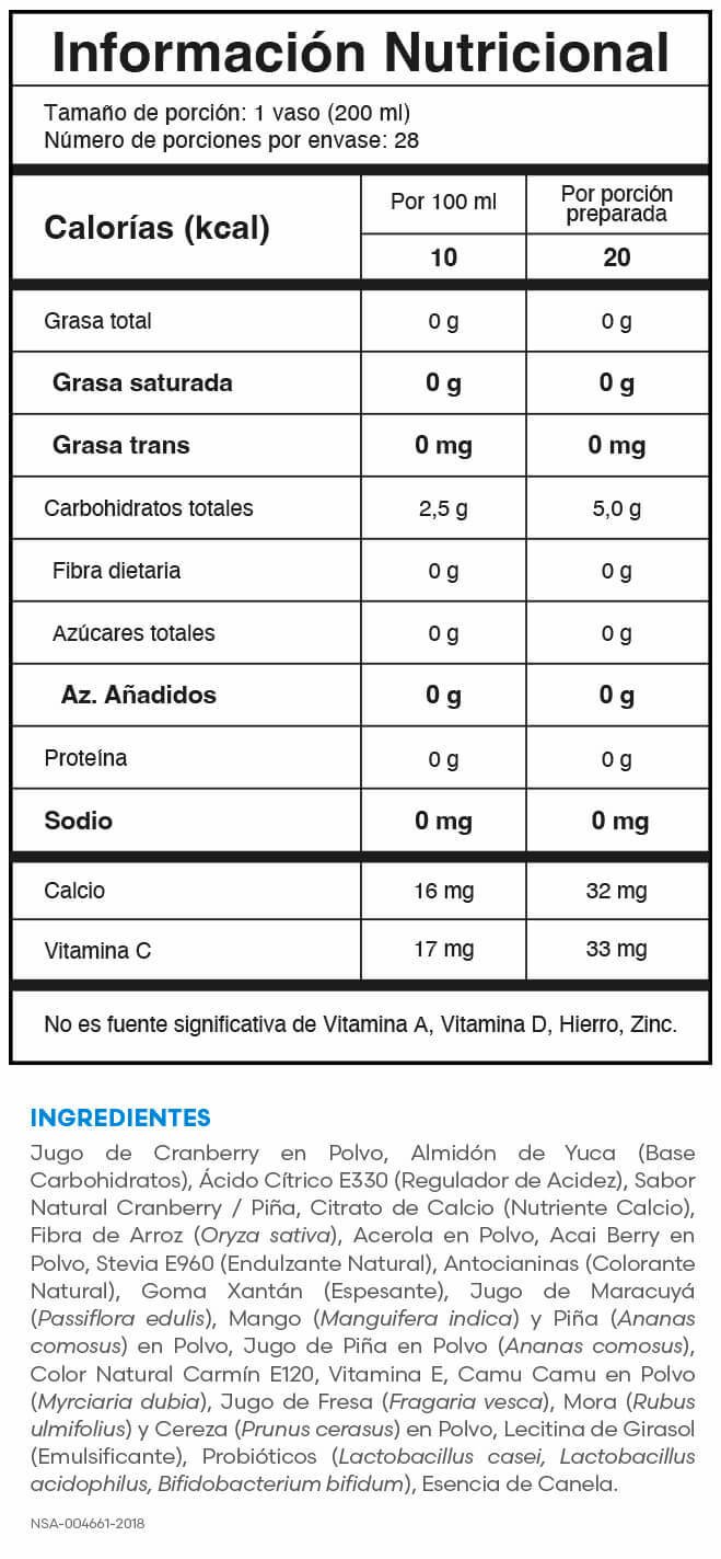 Alimento en polvo a base de cranberry, endulzado con stevia. Sabor cranberry piña NSA-004661-2018