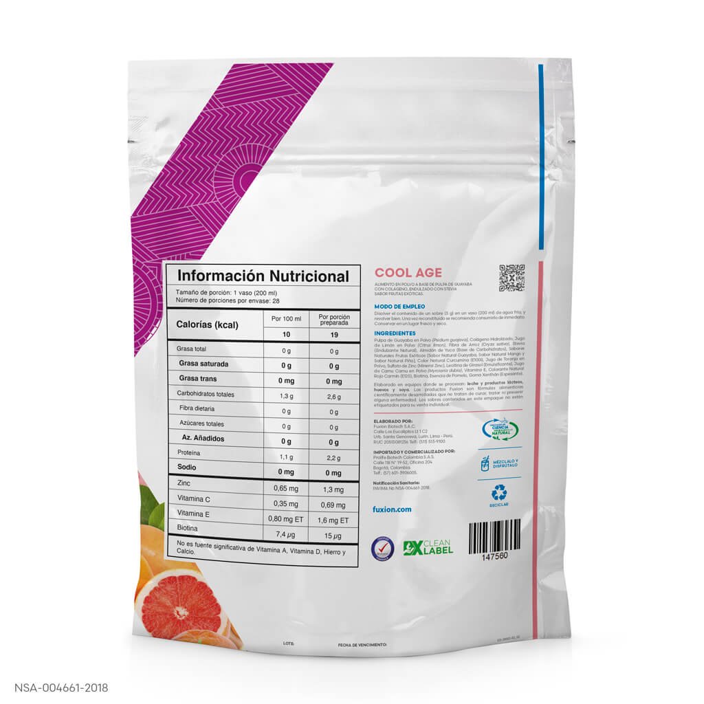 Alimento en polvo a base de pulpa de guayaba con colágeno, endulzado con stevia. Sabor frutas exóticas.