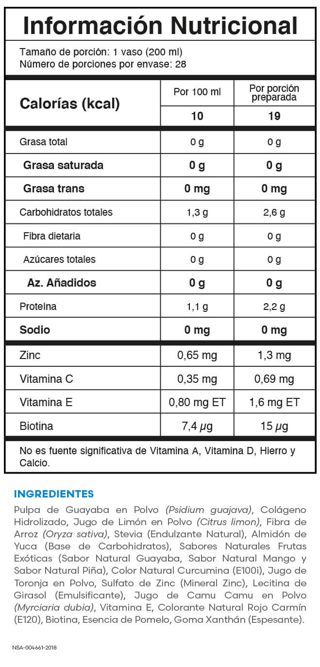 GUAYABA + COLÁGENO HIDROLIZADO + LIMON + TORONJA + PIÑA + MANGO + ZINC + BIOTINA