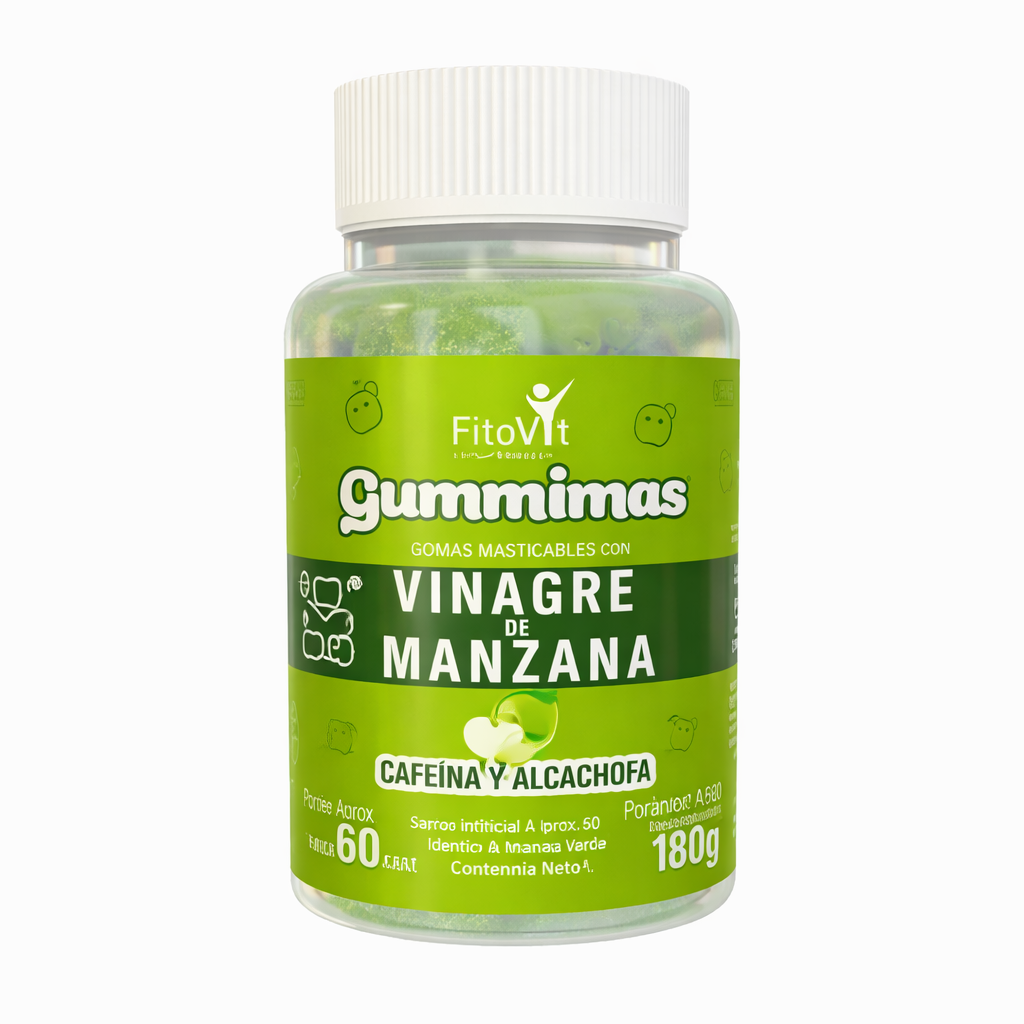 Fitovit Gummimas es un suplemento dietético en forma de gomitas masticables, diseñado para apoyar de manera natural el metabolismo, la digestión y el control de peso. Gracias a su fórmula avanzada con vinagre de manzana, cafeína y alcachofa, aporta energía y favorece la eliminación de toxinas, convirtiéndose en un complemento ideal para quienes desean mantenerse activos y saludables.