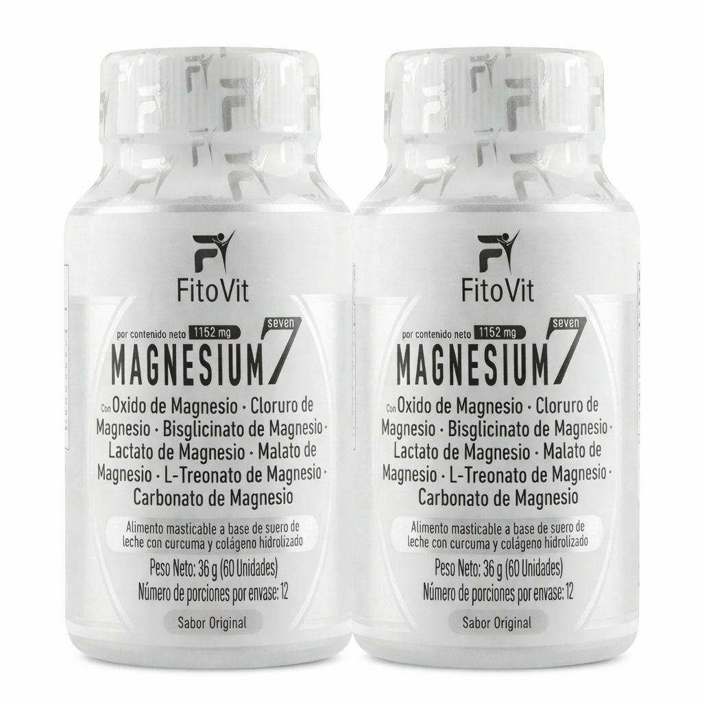 Magnesium7 x60 und FitoVit F rmula premium con 7 tipos de magnesio xido Cloruro Bisglicinato Lactato Malato L Treonato y Carbonato Apoya m s de 300 funciones vitales del cuerpo mejorando energ a sue o m sculos articulaciones y bienestar general Con registro INVIMA y respaldo directo de f brica ngulos de venta ganadoresEnerg a diaria combate el cansancio y la fatiga Sue o reparador favorece la relajaci n y el descanso profundo Salud muscular previene calambres y mejora recuperaci n f sica Bienestar seo y articular fortalece huesos y articulaciones Concentraci n y memoria estimula la claridad mental gracias al L Treonato C mo tomarConsumir 3 tabletas masticables al d a preferiblemente despu s de las comidas Para tener en cuenta Stock ilimitado somos fabricantes directos Todos los productos con registro INVIMA Despacho r pido y seguro en todo el pa s Producto probado y altamente demandado en el mercado