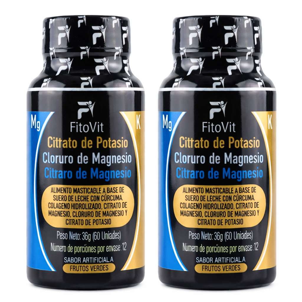 Citratos Fitovit x60 und Tabletas masticables con Citrato de Potasio Cloruro de Magnesio y Citrato de Magnesio enriquecidas con c rcuma y col geno hidrolizado Un aliado para la energ a la movilidad y la salud digestiva Con registro INVIMA y respaldo directo de f brica ngulos de venta ganadoresEnerg a y vitalidad ayuda a reducir el cansancio y la fatiga Salud muscular previene calambres y mejora la recuperaci n Bienestar seo y articular fortalece huesos y articulaciones Digesti n ligera apoya el tr nsito intestinal y alivia la pesadez Practicidad formato masticable sabor frutos verdes f cil de consumir en cualquier momento C mo tomarConsumir 3 tabletas masticables al d a preferiblemente despu s de las comidas Para tener en cuenta Stock ilimitado somos fabricantes directos Todos los productos con registro INVIMA Despacho r pido y seguro en todo el pa s Producto probado y altamente demandado en el mercado